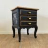 Cet ancien chevet en bois retrouve ses lettres de noblesse grâce à son nouveau design. La sobriété du noir associé à un motif végétal et ses nouvelles poignées en métal brossé lui donne un style tout à fait élégant.